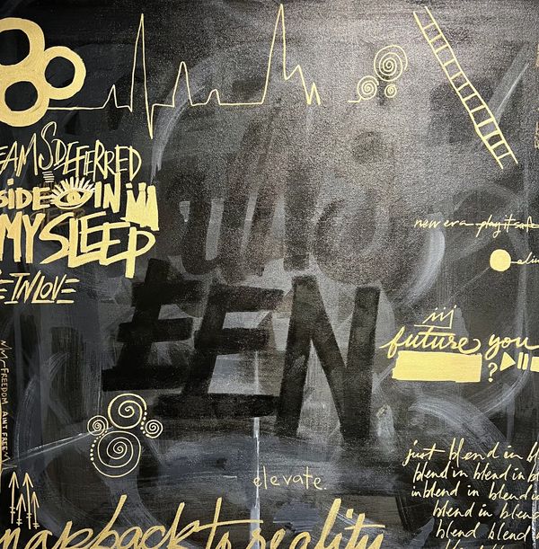 My work is centered around blackness and advances the conversations through a young black woman's perspective often navigating a space that does not allow me to be my full self. My vision is to inspire black and brown voices through paintings and interdisciplinary studies. I navigate identity inspired by pop culture references and tell the stories of people of color centering around humanity and comfort. I am interested in nostalgia about childhood memories, reactionary to the environment it is in. It includes abstraction, reconstruction, and deconstruction of the imagery and material. My body of work visualizes the black experience connecting to brands, popular culture, and hyper-consumerism. I amplify voices within the community by exploring my relationship with sports culture, examining a language between the layering of paint and architecture, and recognizing the design elements within construction.