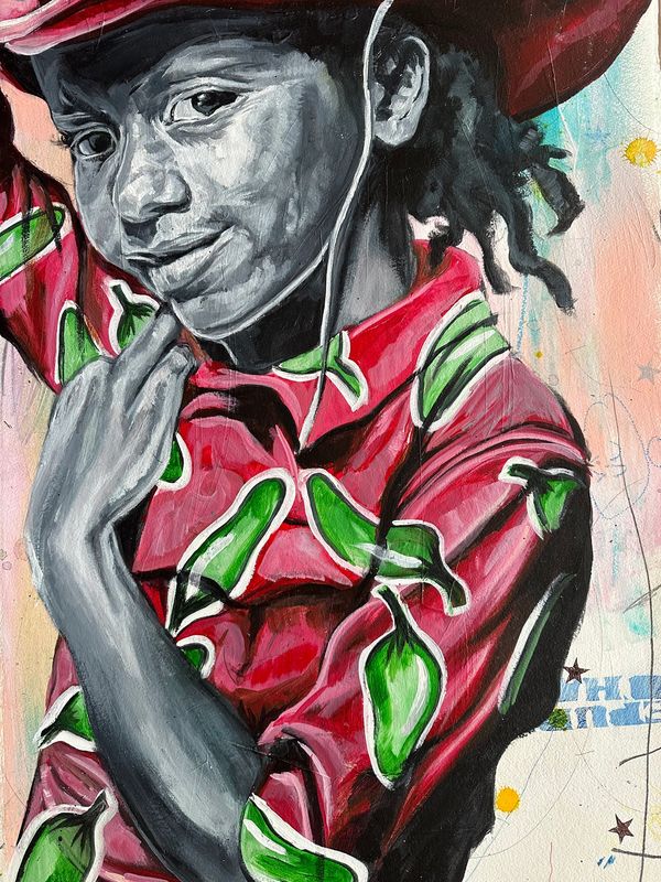 Gregory Saint Amand, also known as GOGO, is a contemporary and figurative American and Haitian artist. He was born in New York but spent much of his early formative years growing up in Haiti. His perspective on what speaks to human consciousness and understanding, the visual lexicons that influence our communication and culture, is gentle but observantly powerful in its nature. He displays his conversation with art, loving to paint in layers to open the canvas and its limits, bringing about a never-ending exploration. His signature vision is evident in the work, which uses bright colors, inks, and other intriguing mediums and details. He plays with ideas that carry weight and then juxtaposes them with more light-hearted subjects. GOGO attended and graduated from The Cooper Union School of Art. His work has been featured in multiple venues and publications such as the Huffington Post, Scope, The Grio, Crème, Art Voice, 101 Top Artist, and MILK mag, to name a few.
