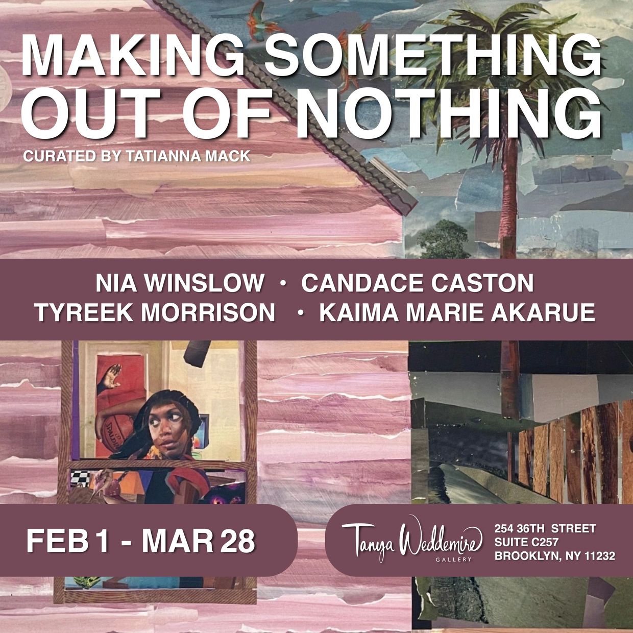 (BROOKYLN, NY) -- Tanya Weddemire Gallery presents "MAKING SOMETHING OUT OF NOTHING", a Black History Month group exhibition curated by Tatianna Mack, from February 1 to March 28, 2026. The exhibition brings together the work of Kaima Marie Akarue, Tyreek Morrison, Nia Winslow, and Candace Caston, whose practices coalesce through collaging worlds shaped by lived experience, memory, and visual expression.