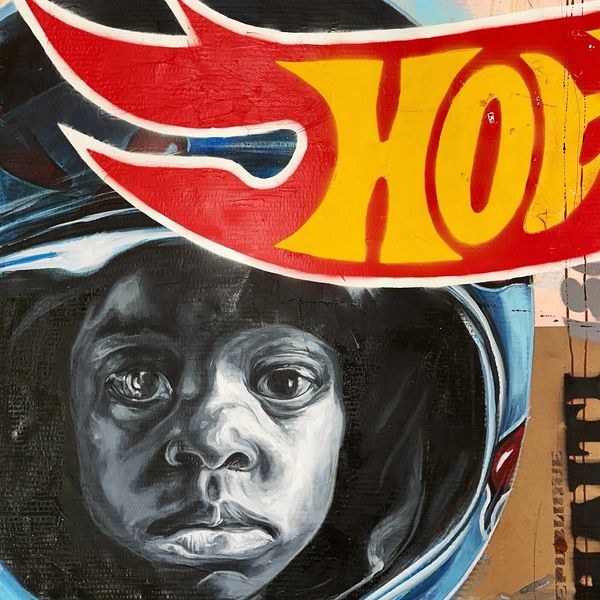 Gregory Saint Amand “PLAYTIME” series starts us on track with the portrait of a young man’s determination filling the canvas in his piece “DRIVEN”. Deep-set irises stare past the audience as if we’re in the way of his destination. The subject’s stare dares us to stop him- as if it were possible. The youth and tenacity etched in this piece reminds the viewer of the desire to achieve goals and dreams bigger than ourselves, with the affirmation that nothing will get in our way. Painted on cardboard, the greyscale subject is made to stand out against the vibrancy of the HOT WHEELS logo emblazoned across the canvas. This work captures an effervescent energy that can only be executed by Gregory Saint Amand.
